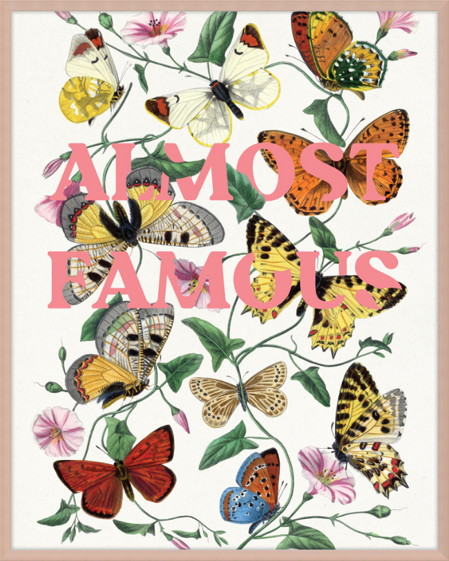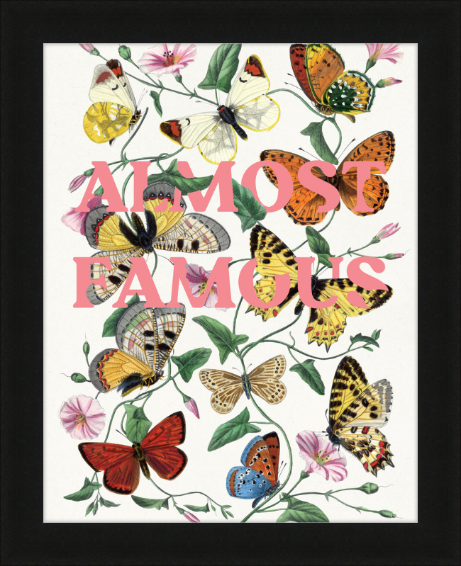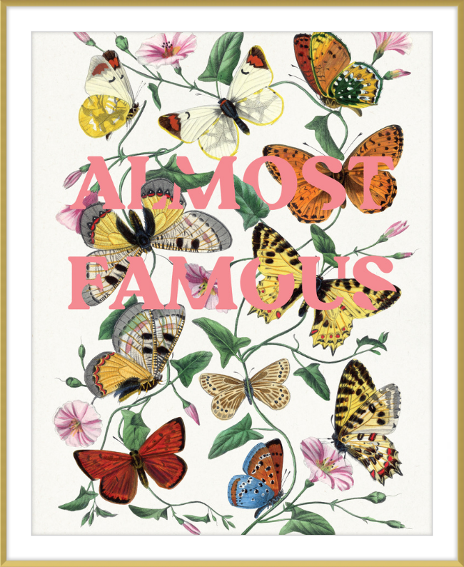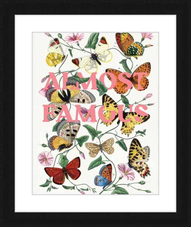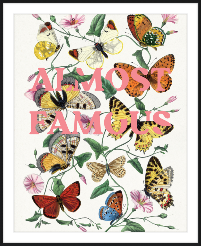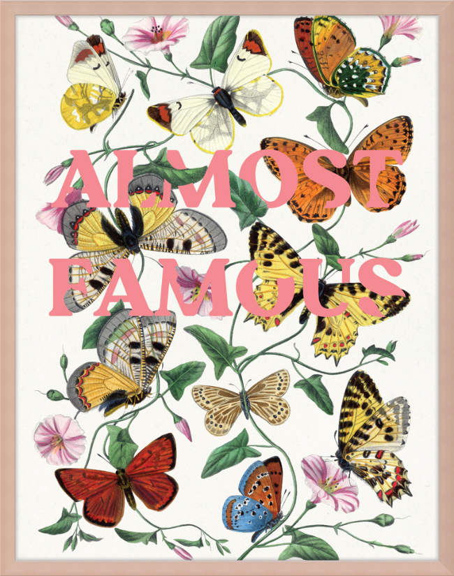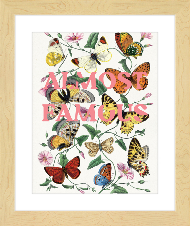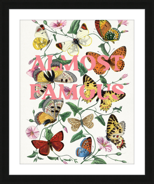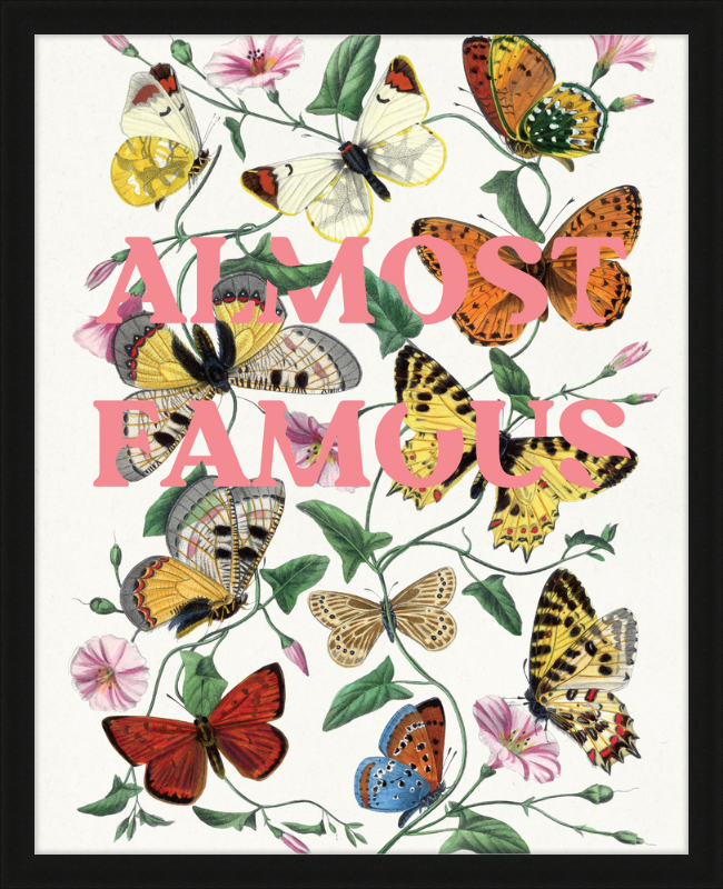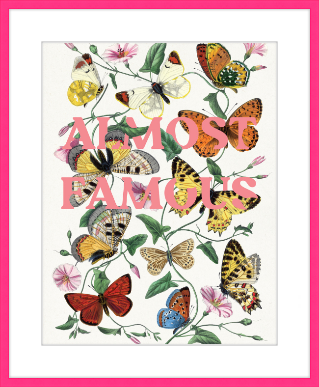 "Almost Famous" is a beautiful and fun combination of classical beauty with a modern, cheeky edge. This vintage Butterfly & Moth print from an 1842 edition of Le Jardin Des Plantes by Paul Gervais is the perfect contrast with a modern typography in a bold rose color palette. Not sure if your space is classic or modern? No need to think any about it any longer - this piece will cover all your bases.