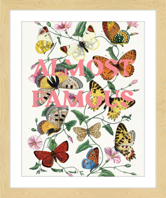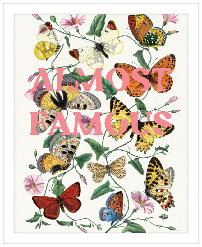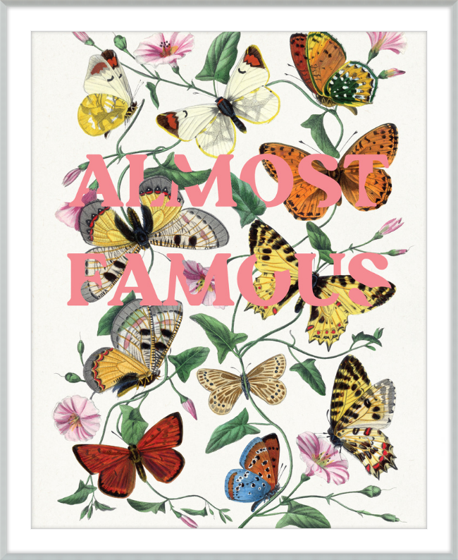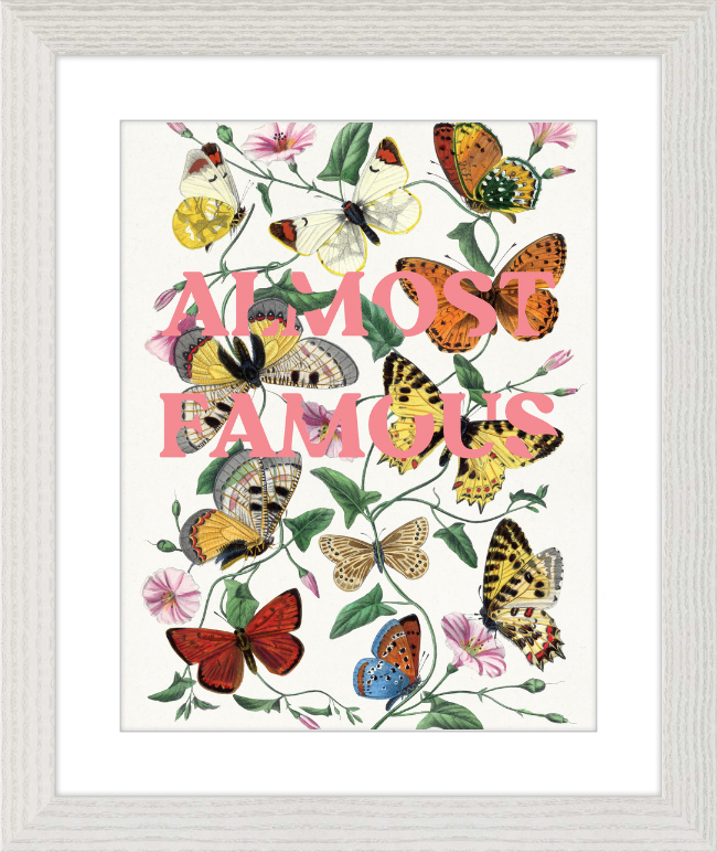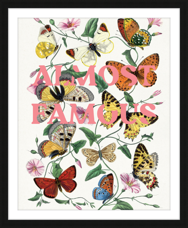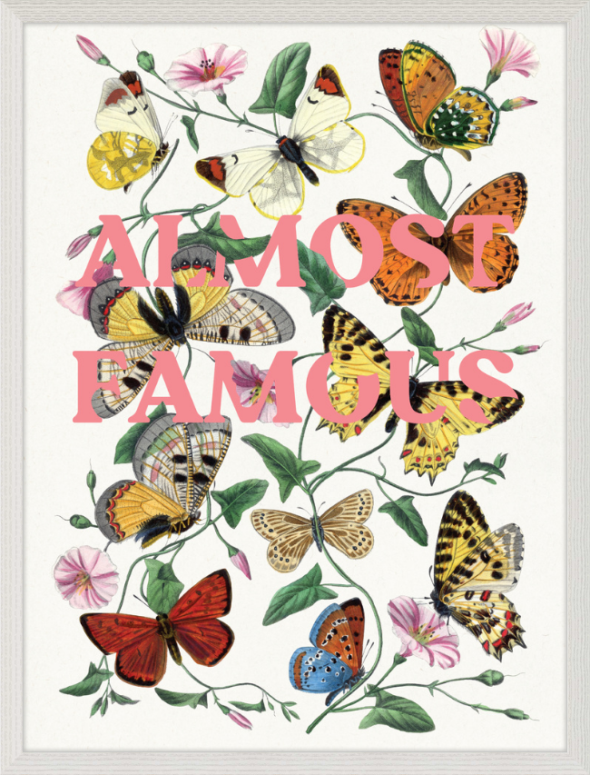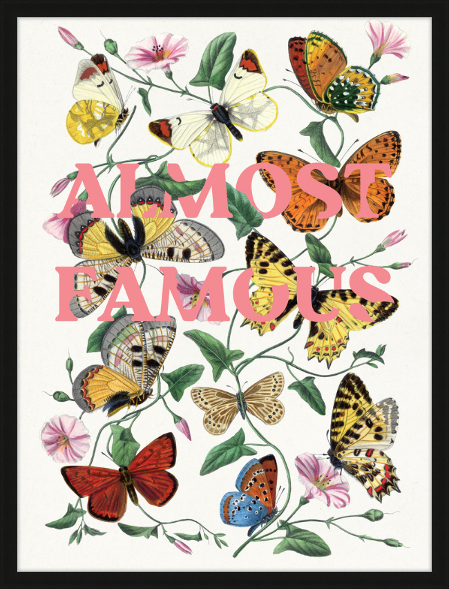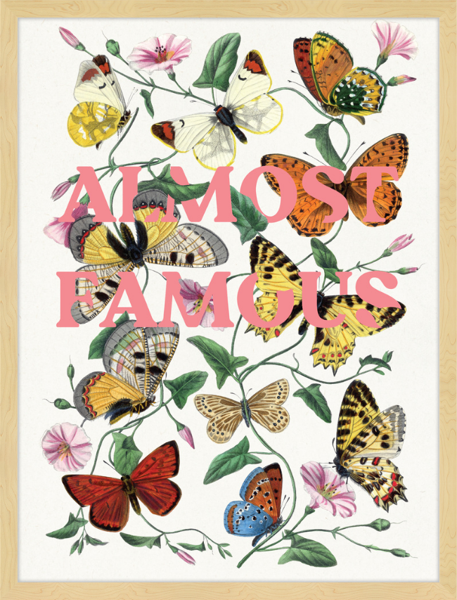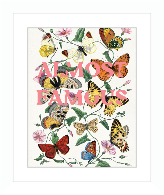 "Almost Famous" is a beautiful and fun combination of classical beauty with a modern, cheeky edge. This vintage Butterfly & Moth print from an 1842 edition of Le Jardin Des Plantes by Paul Gervais is the perfect contrast with a modern typography in a bold rose color palette. Not sure if your space is classic or modern? No need to think any about it any longer - this piece will cover all your bases.