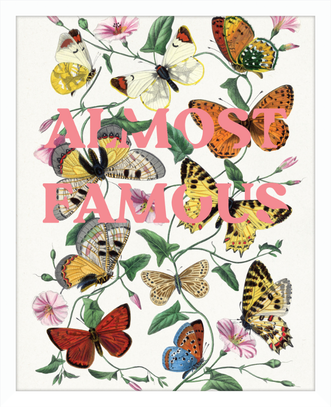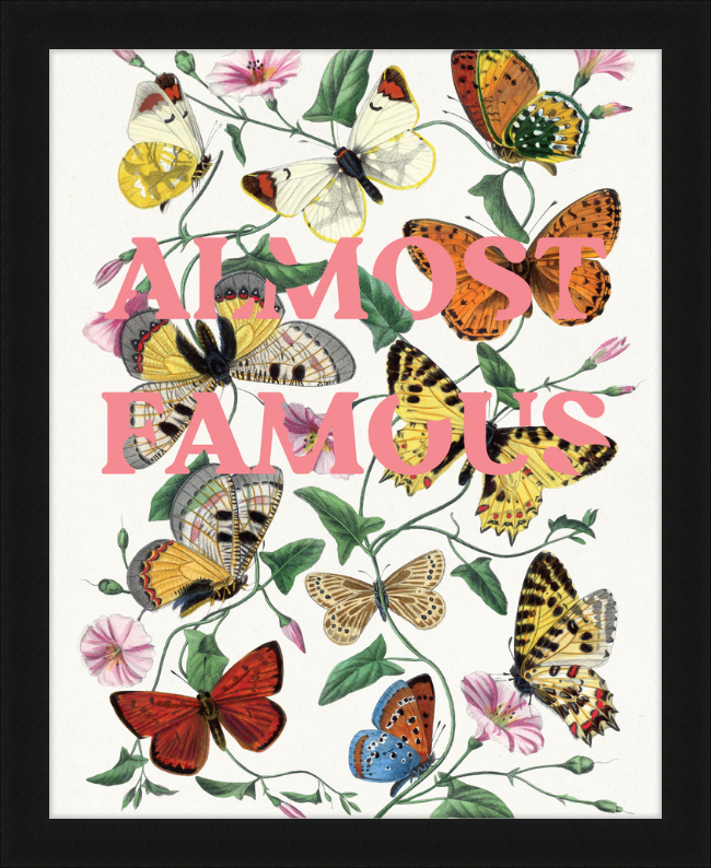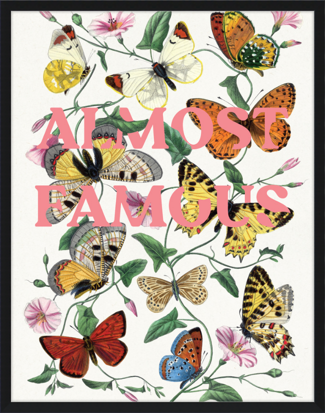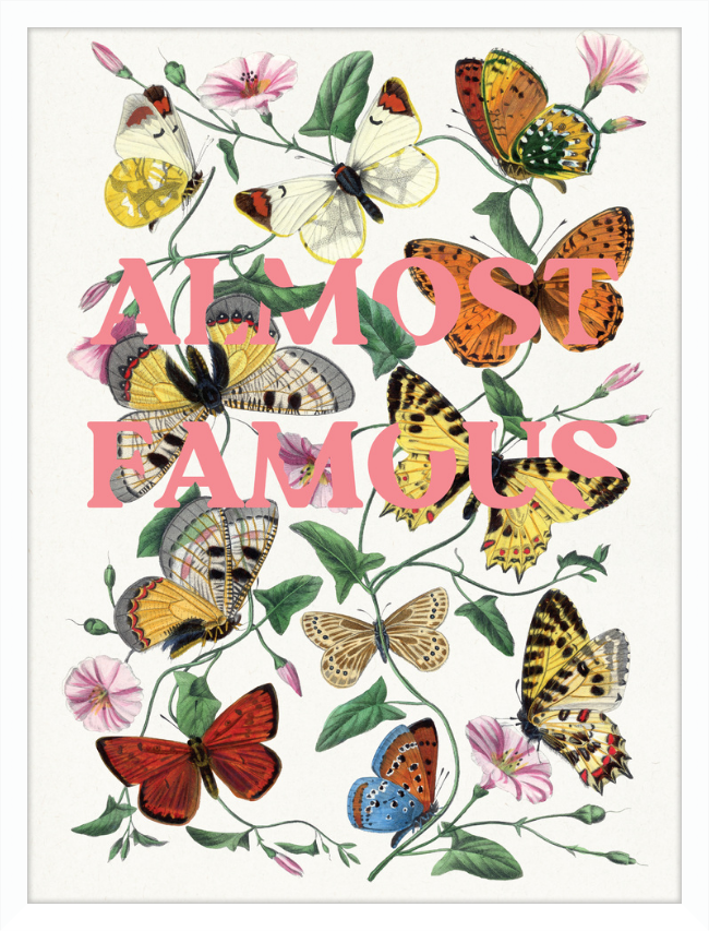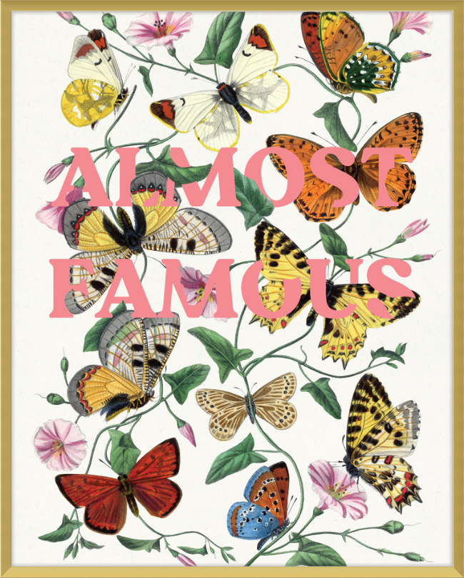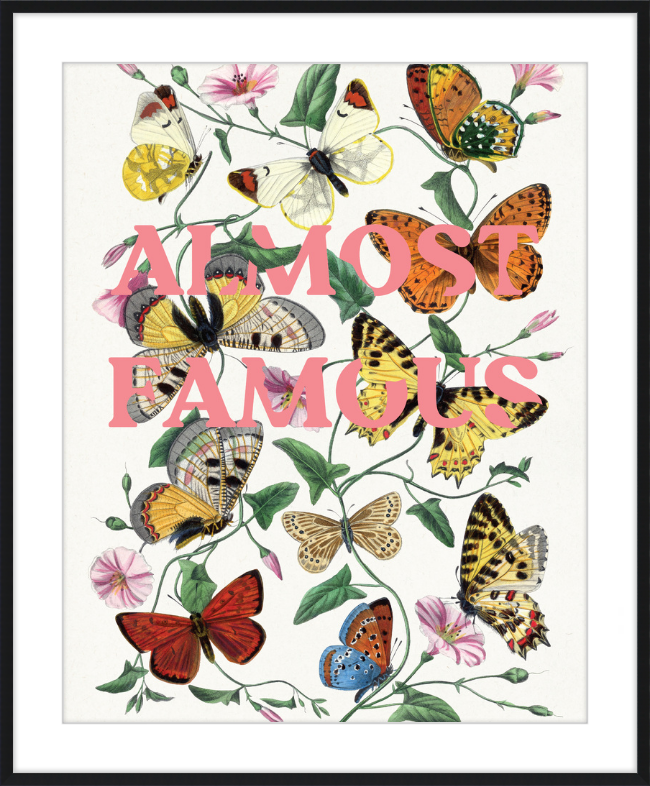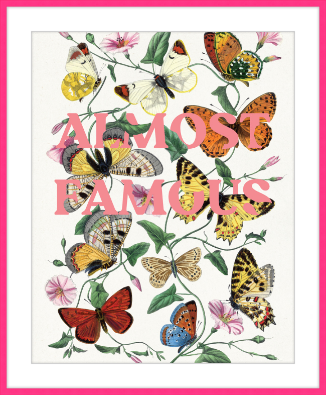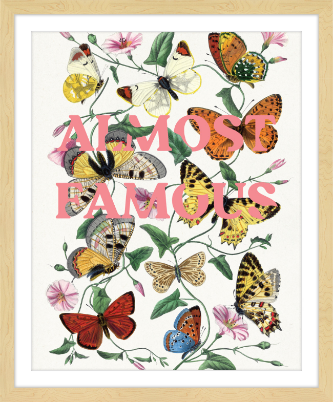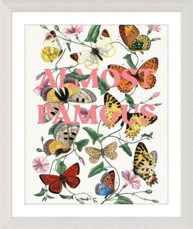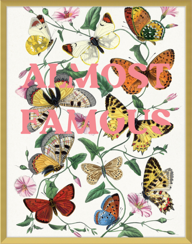 "Almost Famous" is a beautiful and fun combination of classical beauty with a modern, cheeky edge. This vintage Butterfly & Moth print from an 1842 edition of Le Jardin Des Plantes by Paul Gervais is the perfect contrast with a modern typography in a bold rose color palette. Not sure if your space is classic or modern? No need to think any about it any longer - this piece will cover all your bases.
